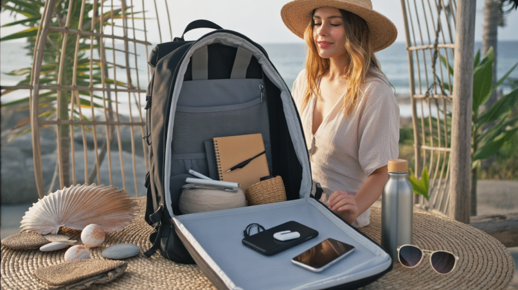 Discover the intentional travel essentials inside a female digital nomad’s backpack; stylish, practical, and designed for freedom-filled minimalist living.